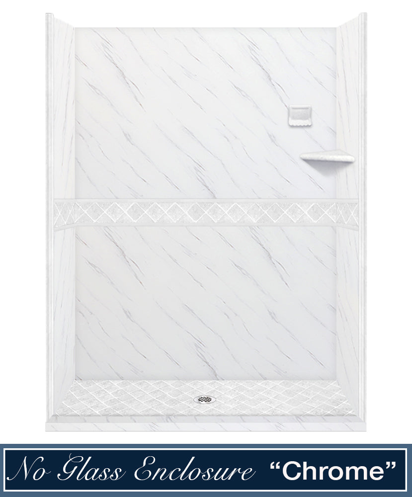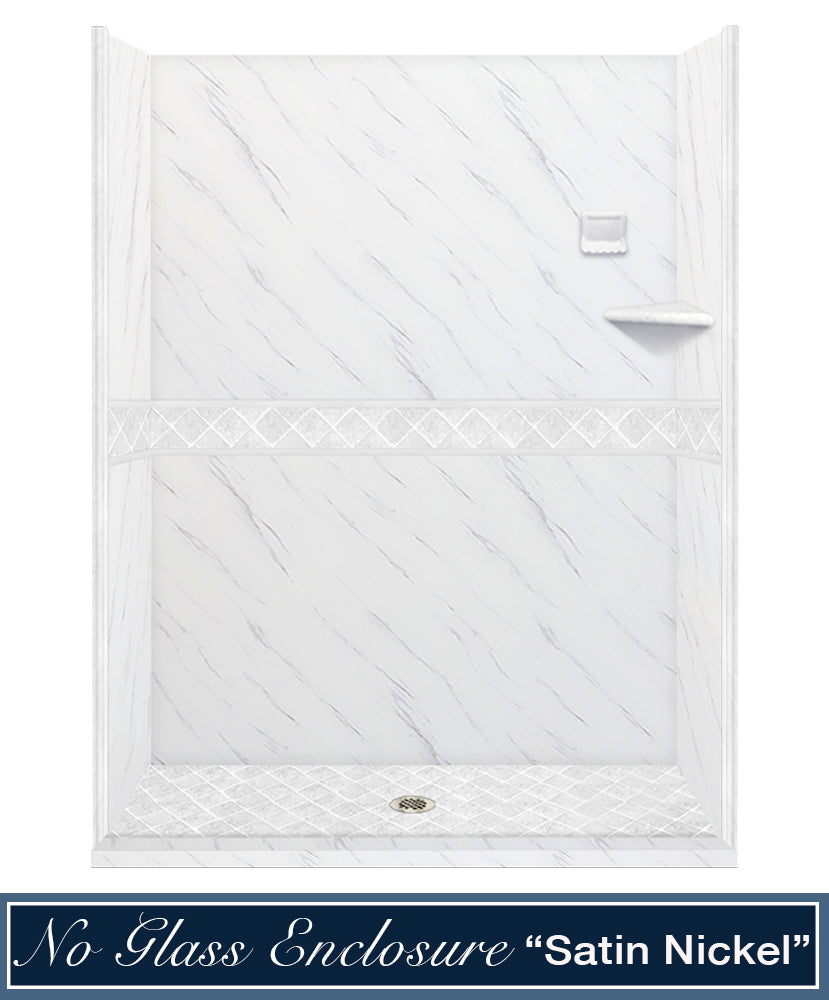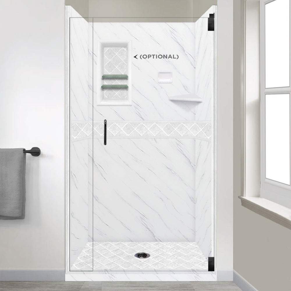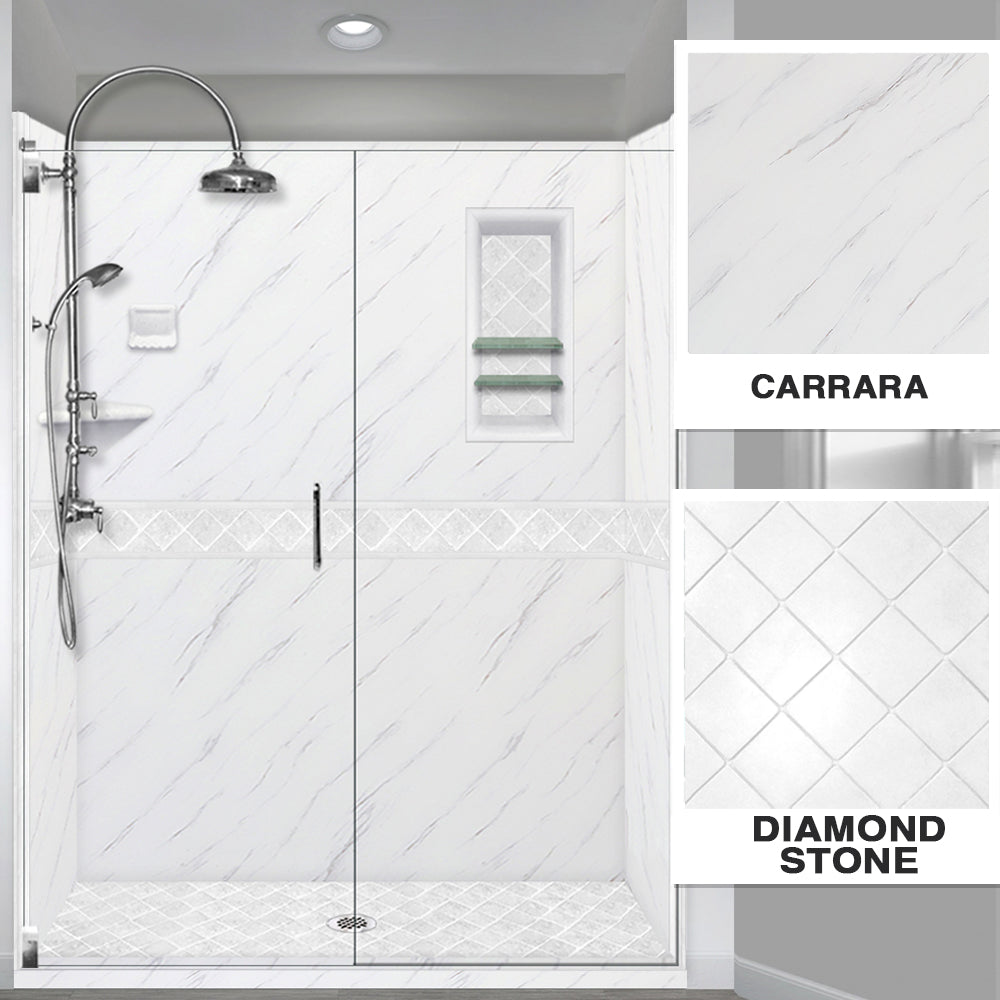 60" Alcove Carrara Medici Marble & Diamond Stone Accent Shower Remodel Kit